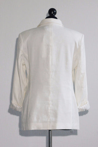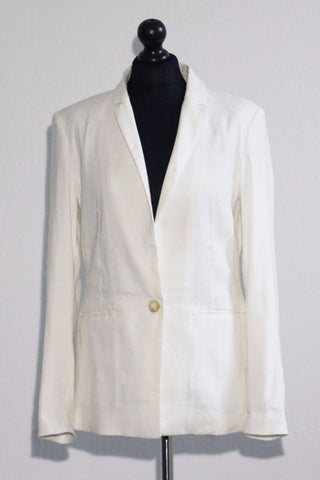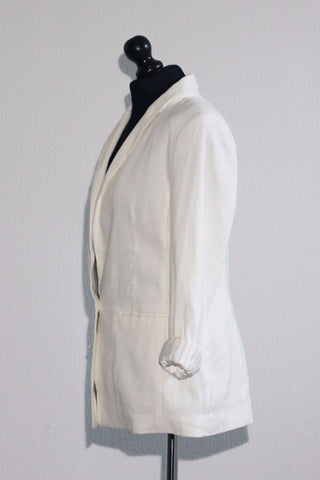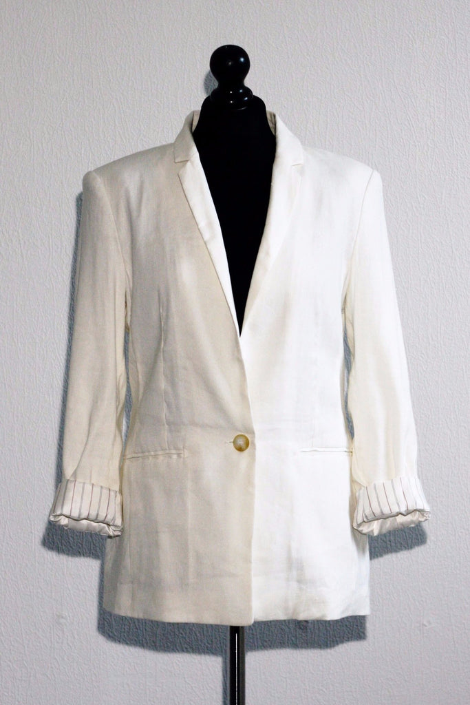 Stilīga pienbalta žakete, var vilkt ar garām rokām, bet var arī atlocīt, jo iešūta strīpaina odere bez iekšvīlēm. Etiķetes cena 99.95EUR.