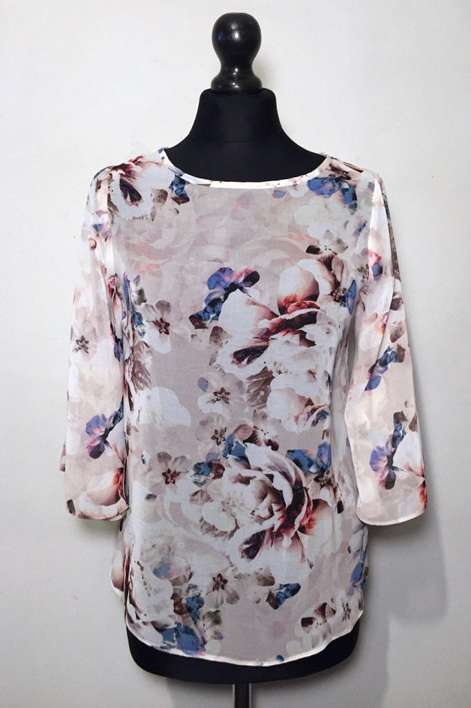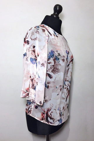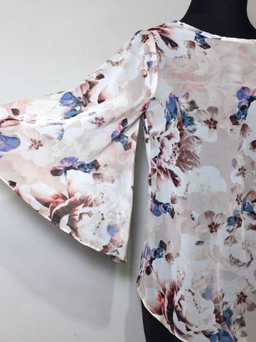 Viegls un nedaudz caurspīdīgs tops, 3/4 piedurknes un galiem paplatinātas jeb zvanu veida.