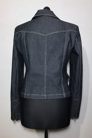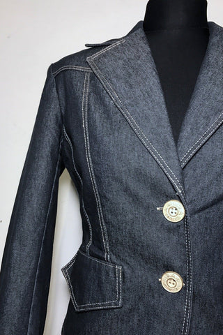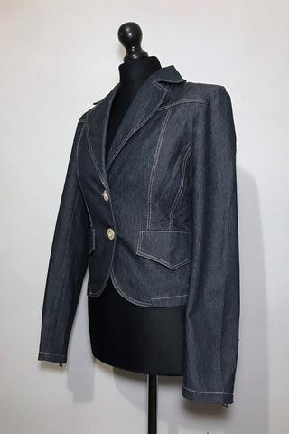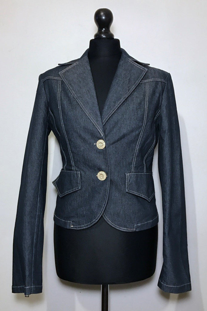 Džinsa tipa žakete uz auguma. Aizpogājama uz 2 podziņām.